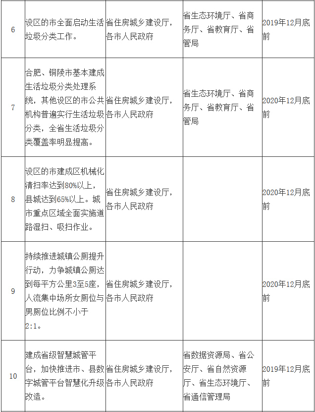 (十)推進(jìn)城市生活垃圾分類。加快建立各級(jí)政府高位推動(dòng)、城市社區(qū)具體實(shí)施、公共機(jī)構(gòu)示范帶頭、專業(yè)公司提供服務(wù)、社會(huì)公眾廣泛參與的工作機(jī)制,有序推進(jìn)城市生活垃圾分類。2019年年底前,設(shè)區(qū)的市全面啟動(dòng)生活垃圾分類工作。2020年年底前,合肥、銅陵市基本建成分類投放、分類收集、分類運(yùn)輸、分類處置的生活垃圾分類處理系統(tǒng),其他設(shè)區(qū)的市公共機(jī)構(gòu)普遍實(shí)行生活垃圾分類,全省生活垃圾分類覆蓋率明顯提高。加快推進(jìn)垃圾收運(yùn)網(wǎng)絡(luò)與再生資源回收利用網(wǎng)絡(luò)“兩網(wǎng)融合”。