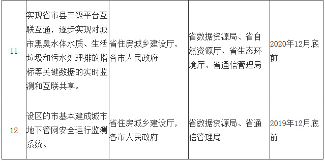 (二十)推進(jìn)城市管理智能化。統(tǒng)籌推進(jìn)全省智慧城管建設(shè),到2019年年底,建成省級(jí)智慧城管平臺(tái),加快推進(jìn)市、縣數(shù)字城管平臺(tái)智慧化升級(jí)改造。到2020年年底,實(shí)現(xiàn)省市縣三級(jí)平臺(tái)互聯(lián)互通,逐步實(shí)現(xiàn)對(duì)城市黑臭水體水質(zhì)、生活垃圾和污水處理排放指標(biāo)等關(guān)鍵數(shù)據(jù)的實(shí)時(shí)監(jiān)測(cè)和互聯(lián)共享。加快城市地下管網(wǎng)地理信息系統(tǒng)和安全運(yùn)行監(jiān)測(cè)系統(tǒng)建設(shè),到2019年年底,設(shè)區(qū)的市基本建成城市地下管網(wǎng)安全運(yùn)行監(jiān)測(cè)系統(tǒng)。