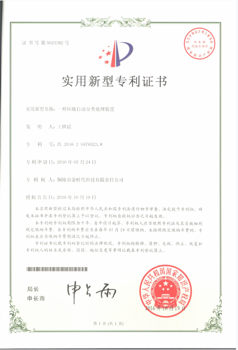 實(shí)用新型專利(一種垃圾自動分類處理裝置)